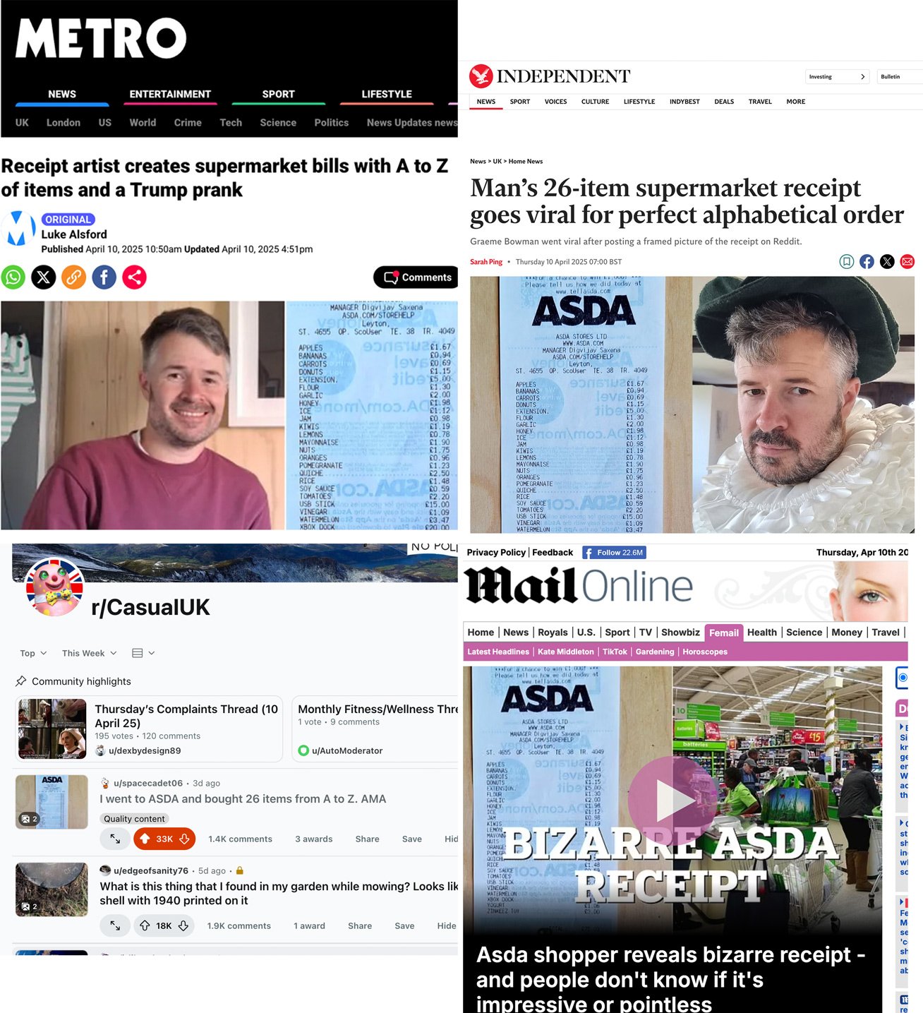 Graeme’s ongoing art project is to create art from supermarket receipts. The first piece was a sillouette of a Christmas tree however, things really took off when he created the A to Z, 26 items, one starting with each letter of the alphabet. This resulteed in over 5 million views on Reddit, appearing on various news websites. Appearing in the physical copy of The Metro and being interviews on two radio stations.