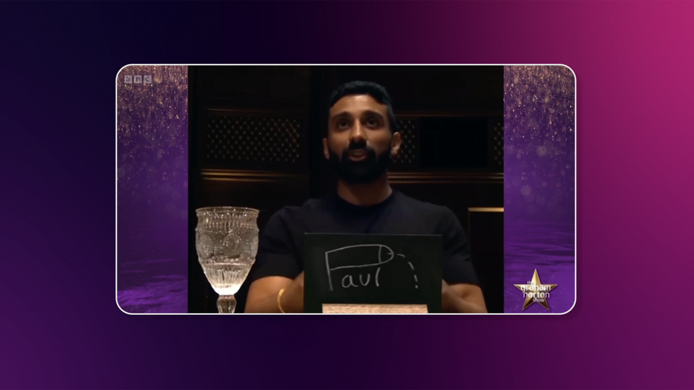 Have you see the TV smash hit, The Traitors? They hold up chalkboards will people’s names written on to vote them off the show. Graeme realised he could change these chalkboards almost seamlessly for comic effect.